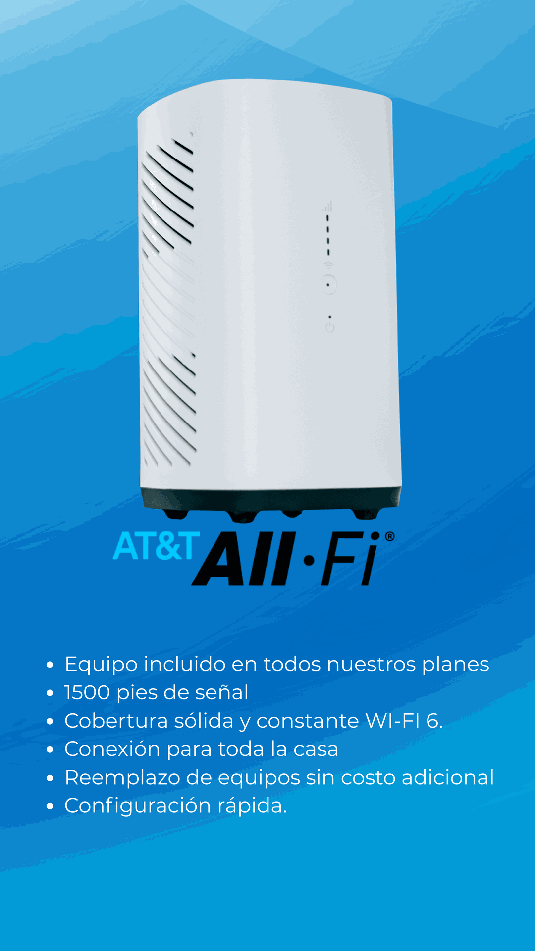 Cuando tu servicio de Internet esté instalado, nuestros tecnico dejan un portal de WI-FI nuevo. Además, si lo deseas, podemos ayudarte a configurar el servicio de cobertura de Wi-Fi extendida para que tengas señal en todo tu hogar.